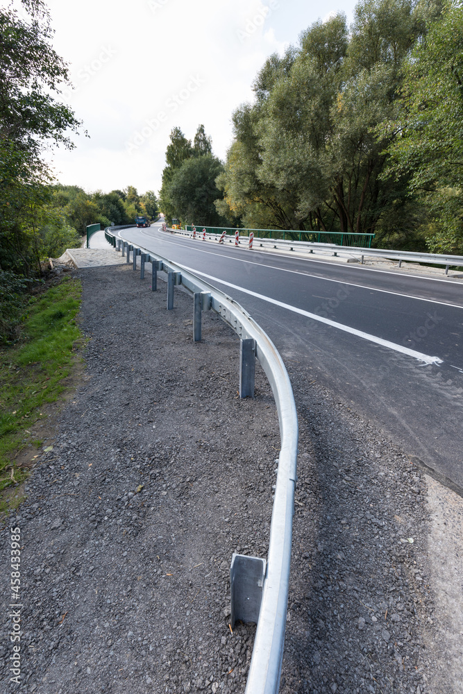 A new bridge across a small river. Summer time. Small reinforced concrete bridge after reconstruction. New asphalt.