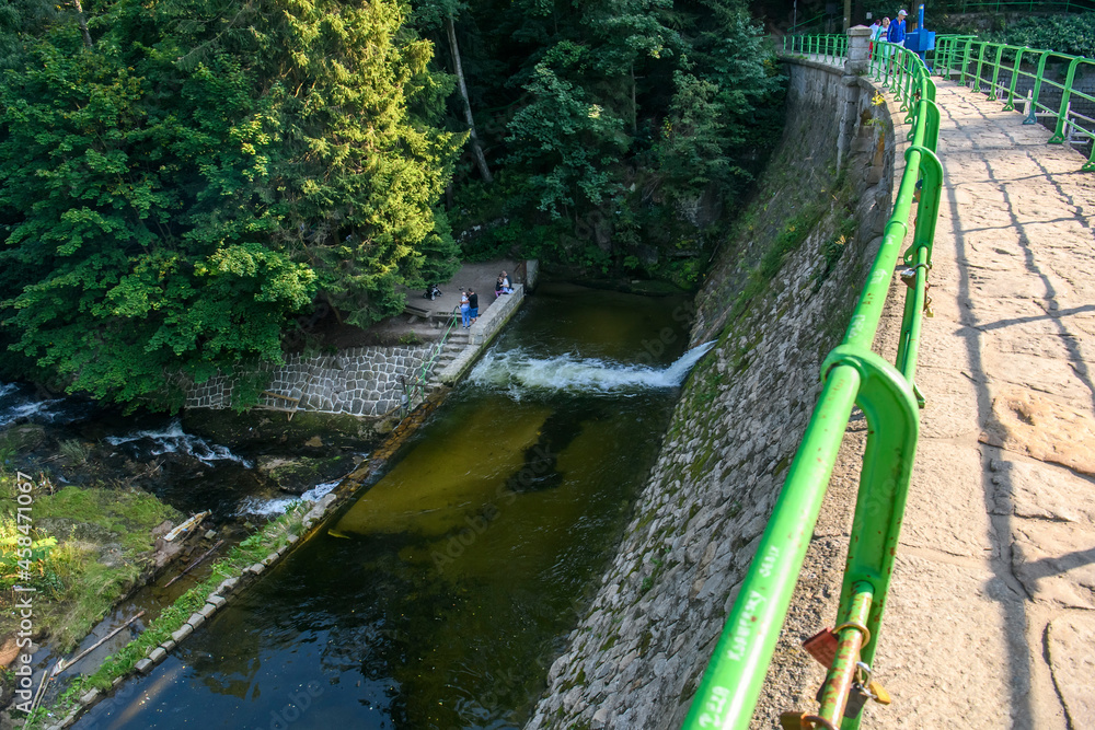 View to Dam on the Lomnica River, semicircular dam with five overflows, on the Lomnica River, in Karpacz, Poland