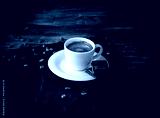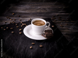 A white porcelain cup of double espresso with tight crema and two chocolate bars on a slate placed on the dark wooden table with scattered coffee beans, close up