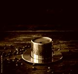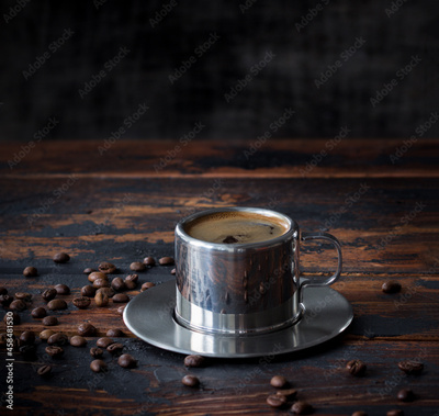 Cup of coffee on a dark rustic wooden table among coffee beans, blended, vintage