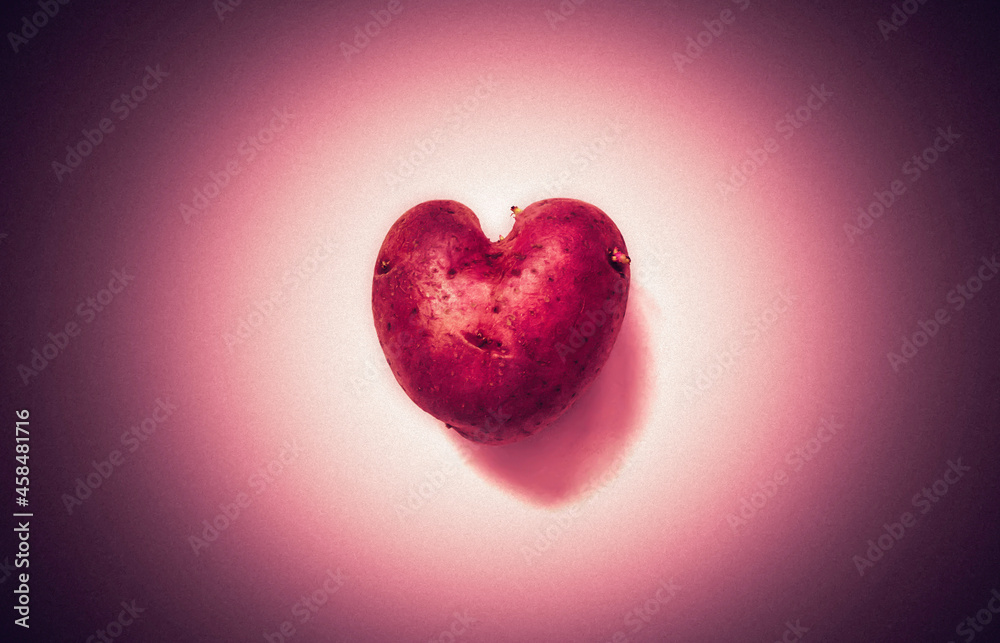 Grained treatment, heart shaped potato on a purple, isolated, valentine day