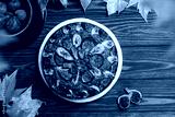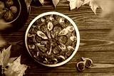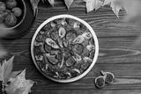 Homemade sweet baked pie with figs and bananas. Autumn background. Flat lay, top view.