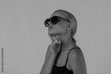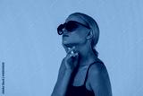 Fashion. Woman in Colorful neon light. Fashionable model portrait in sunglasses creative art neon pink blue light, banner