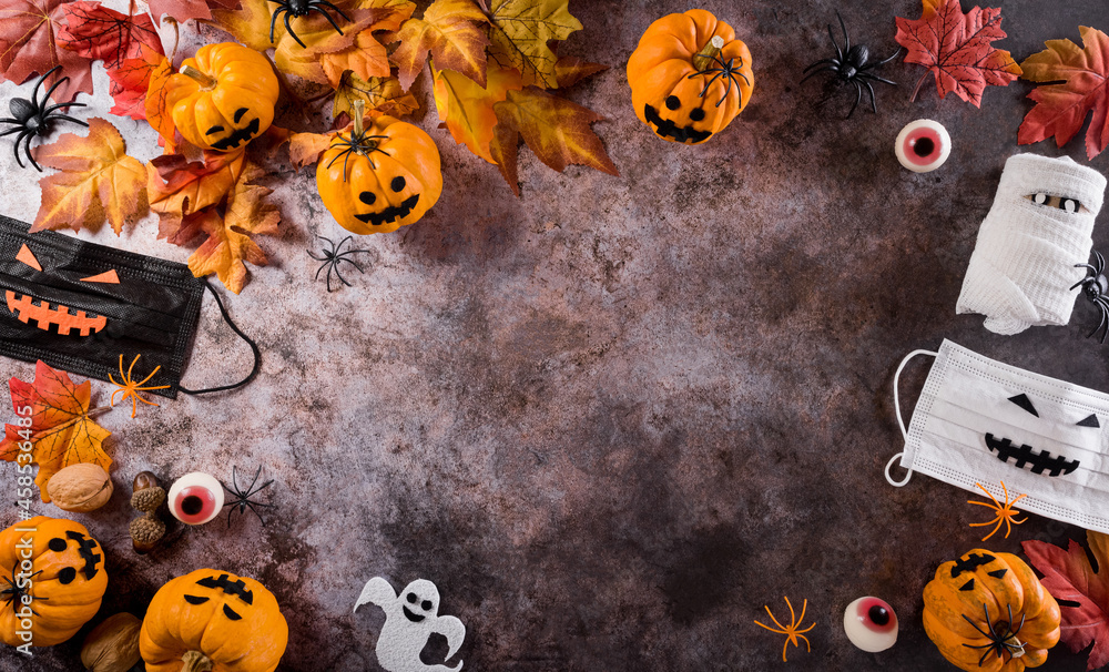 Halloween decorations made from pumpkin, paper bats,medical mask and black spider on dark stone background. Flat lay, top view with copy space for text.