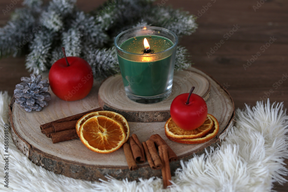 Duftkerze mit Orangenscheiben, Zimtstangen und Äpfeln.