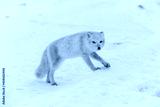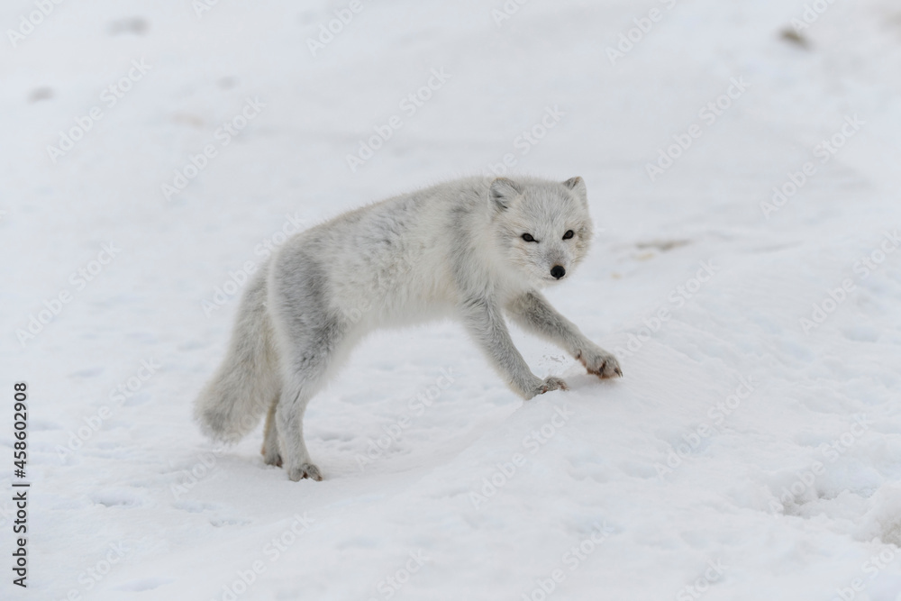 Young arctic fox in winter tundra. Grey arctic fox puppy.