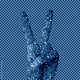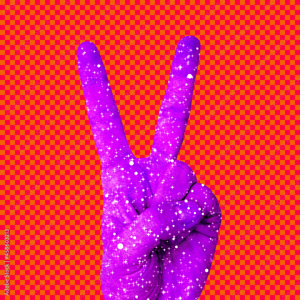 Contemporary minimal art collage. Surreal abstraction cosmic hand victory gesture on geometry background.