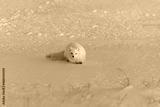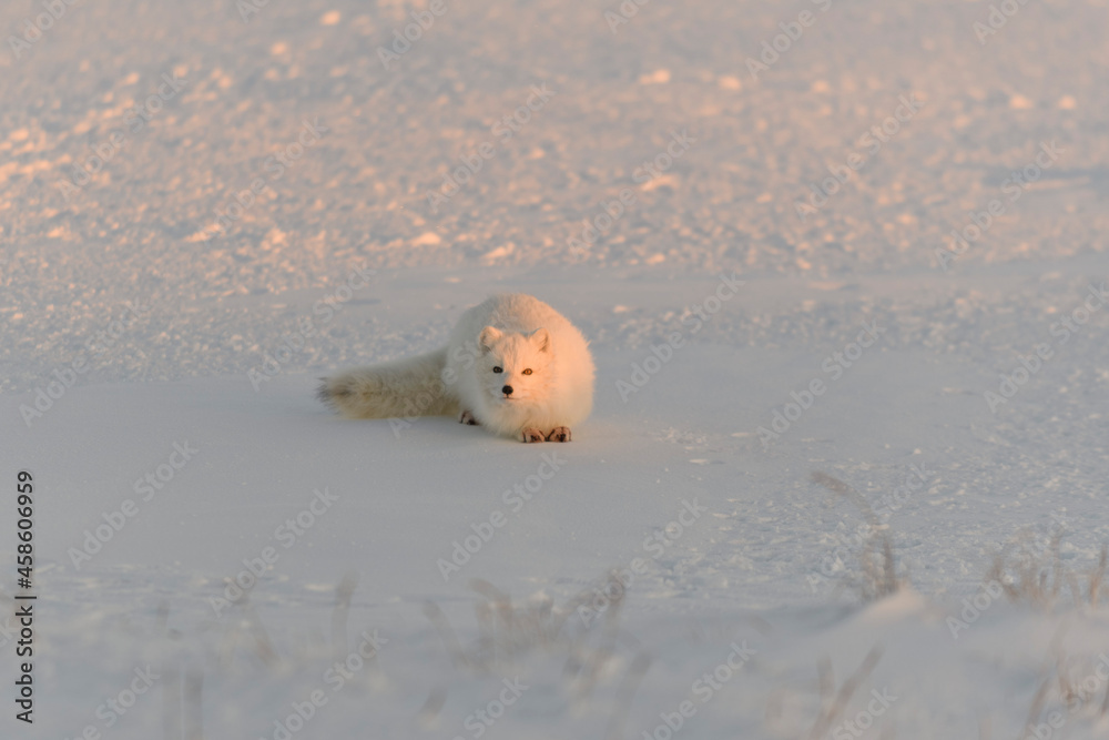 Arctic fox (Vulpes Lagopus) in wilde tundra at sunset time. Golden hour.
