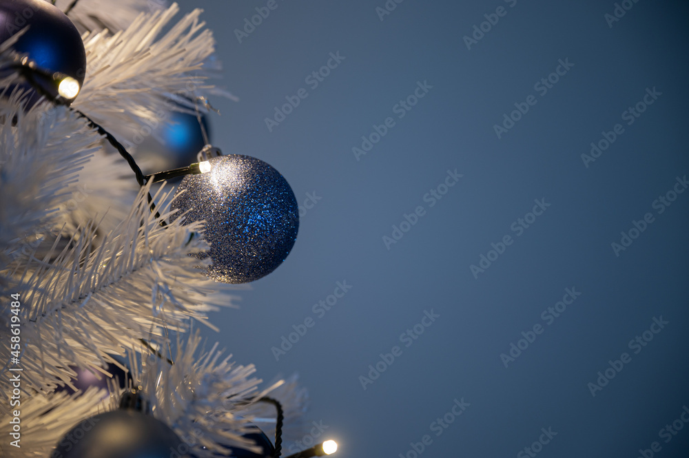 Festive image of blue christmas bubbles on white holiday tree