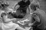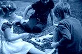 Three kids looking at snails in the grass