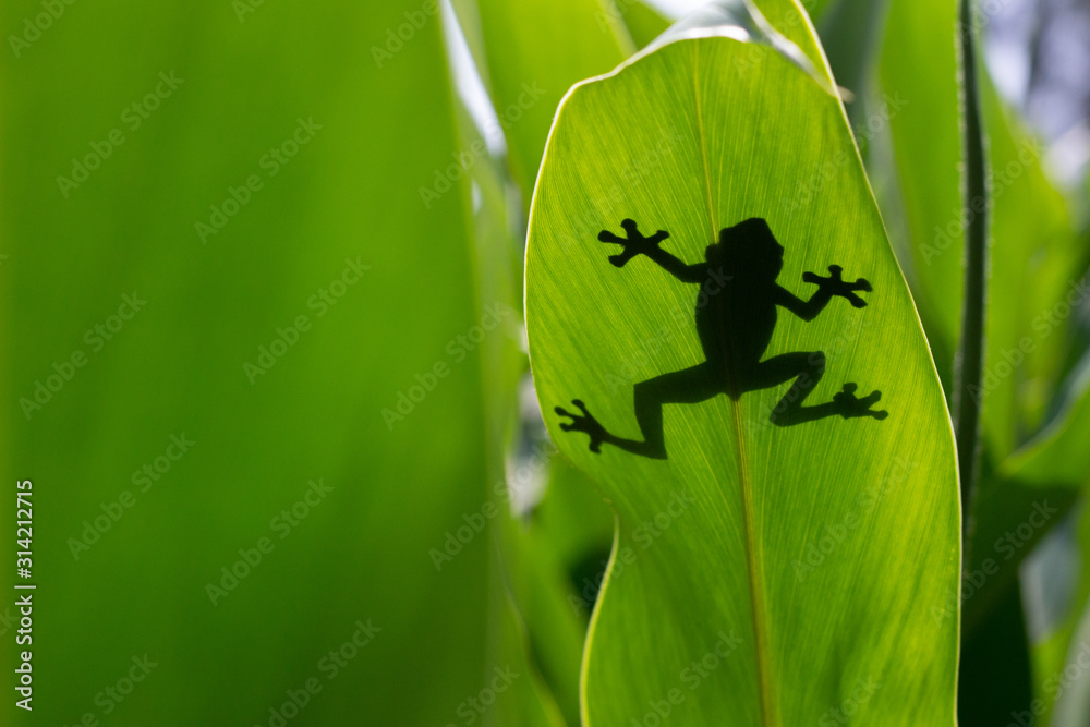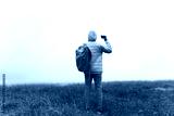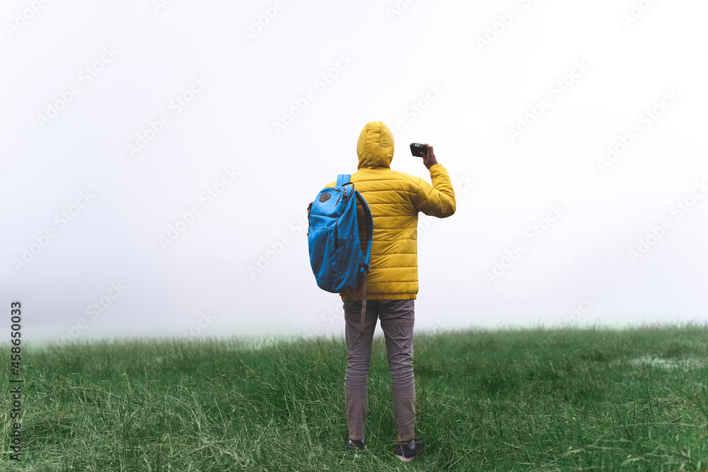Outdoors adventure trek activity hiker wearing yellow waterproof raincoat enjoying rainy weather.