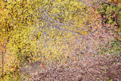 Dry yellow leaves flew off the bird cherry on the autumn ground
