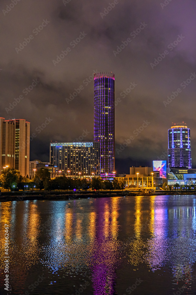 The business quarter of the city on the river bank on a late autumn evening