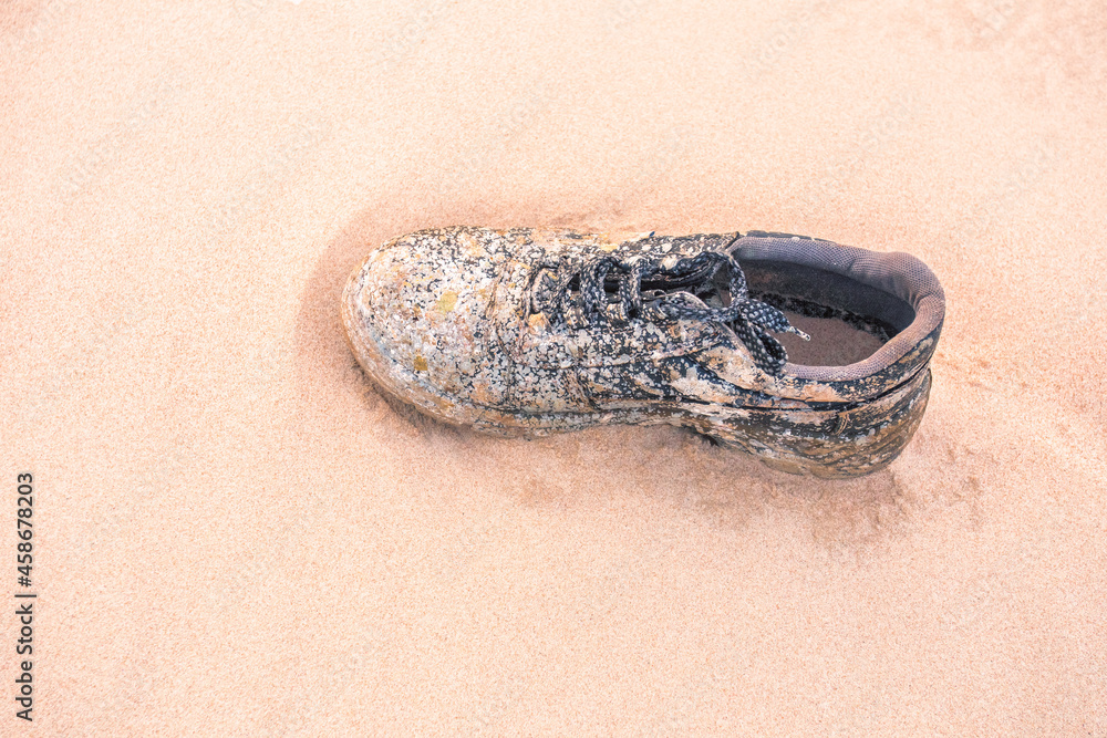 Close Up Of old shoe Weathered On Beach Sand Pollution Litter Rubbish In The Baltic sea