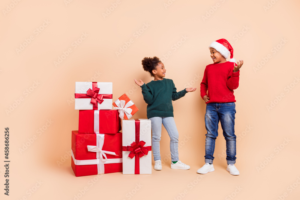 Photo of two friendly kids talk share gifts enjoy tradition wear x-mas hat jumper isolated beige color background