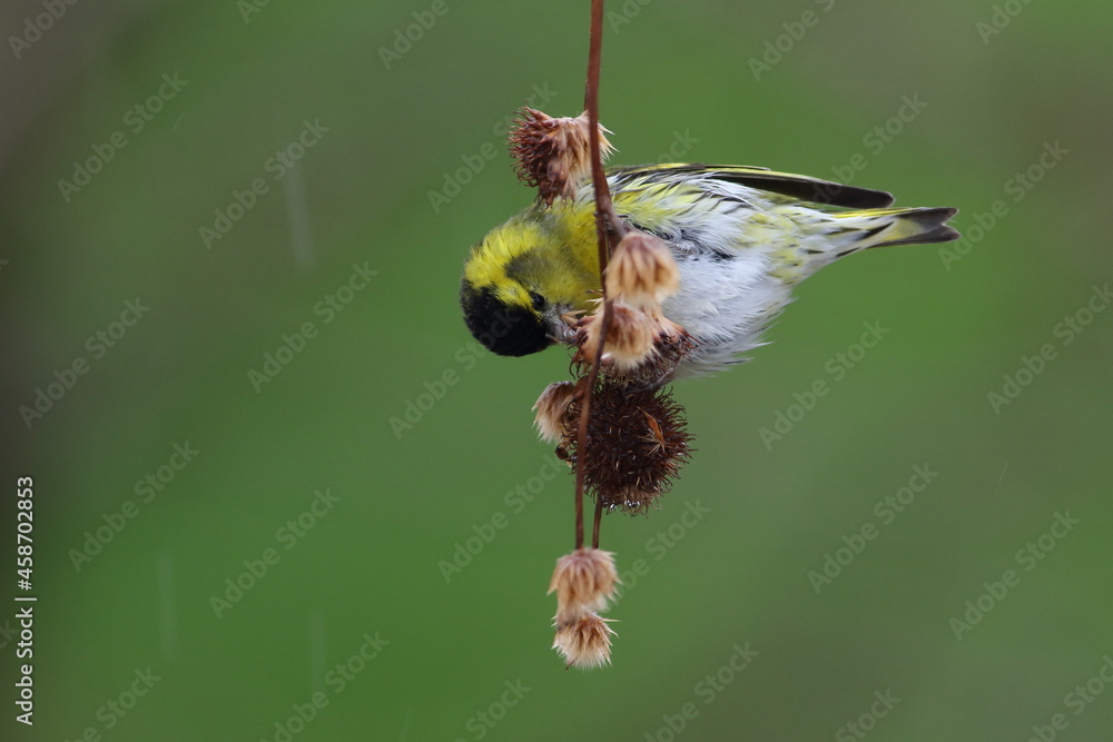 Eurasian Siskin on a branch eating plane tree seed under the rain