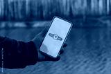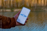 Man holds a smartphone in his hand with a free wi-fi icon on the display. Phone on the background of the forest and lake. Free internet access in nature.
