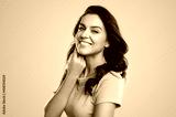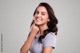 Happy adult woman touching cheek