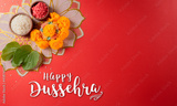 Happy Dussehra. Yellow flowers, green leaf and rice on red background. Dussehra Indian Festival concept.