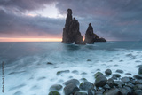 Morning seascape sunrise of Madeira. Rocky shore, silhouette of two steep cliffs and misty rocks hit by waves. Long exposure. Ribeira da Janela, traveling Madeira island, Portugal. Volcanic rocks