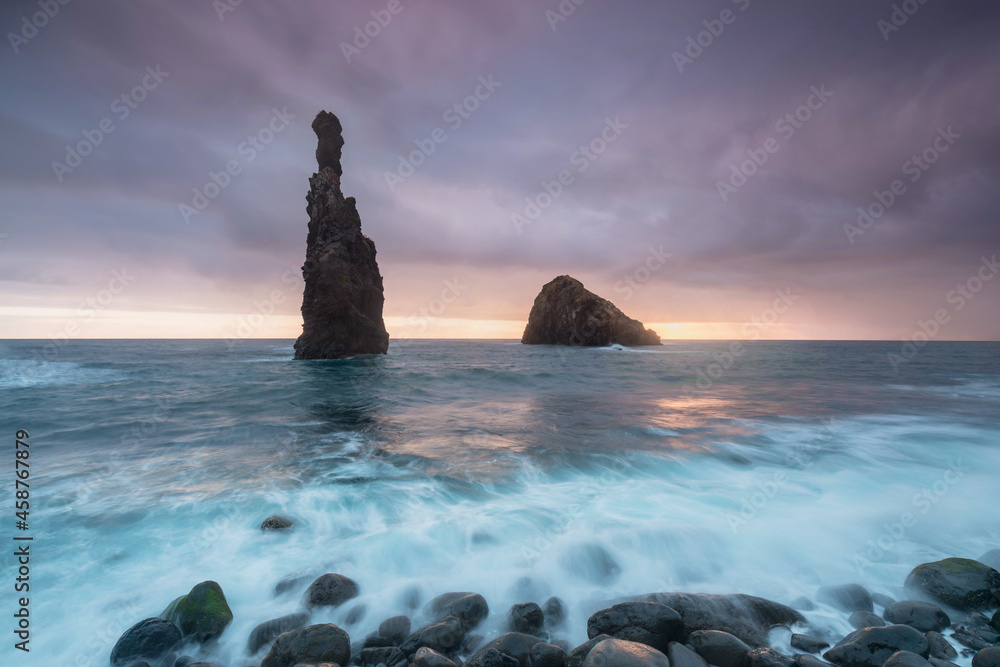 Morning seascape sunrise of Madeira. Rocky shore, silhouette of two steep cliffs and misty rocks hit by waves. Long exposure. Ribeira da Janela, traveling Madeira island, Portugal. Volcanic rocks