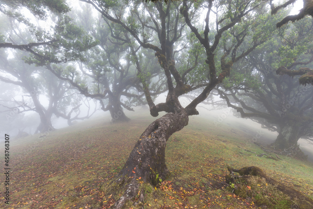 Magical endemic laurel trees in Fanal laurisilva forest in Madeira, World Heritage Site by UNESCO in Portugal. Beautiful green summer woods with thick fog Rainforest in rainy day. Solitary trees.