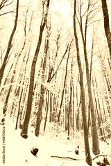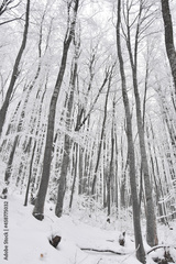 Winter Forest Landscape. Snow on trees in mountain forest. Concept of winter and snow