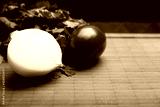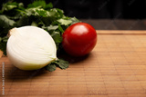 fresh raw middle onion, tomato and cilantro on bamboo wooden board with copy space. Basic ingredients for mexican food