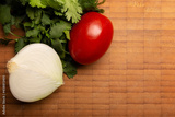 top view of fresh raw middle onion, tomato and cilantro on bamboo wooden board with copy space. Basic ingredients for mexican food