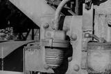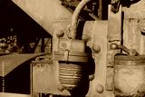 Industrial structures painted red with rusting areas, metal objects, horizontal aspect