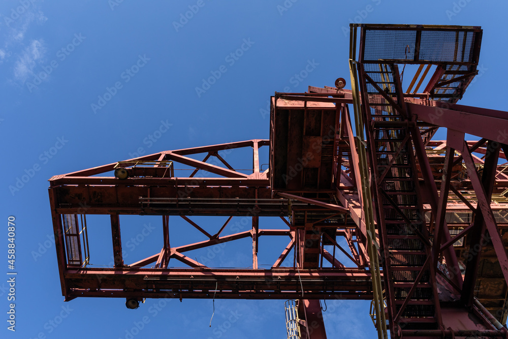 View looking up through industrial structures with stairs and walkways, horizontal aspect