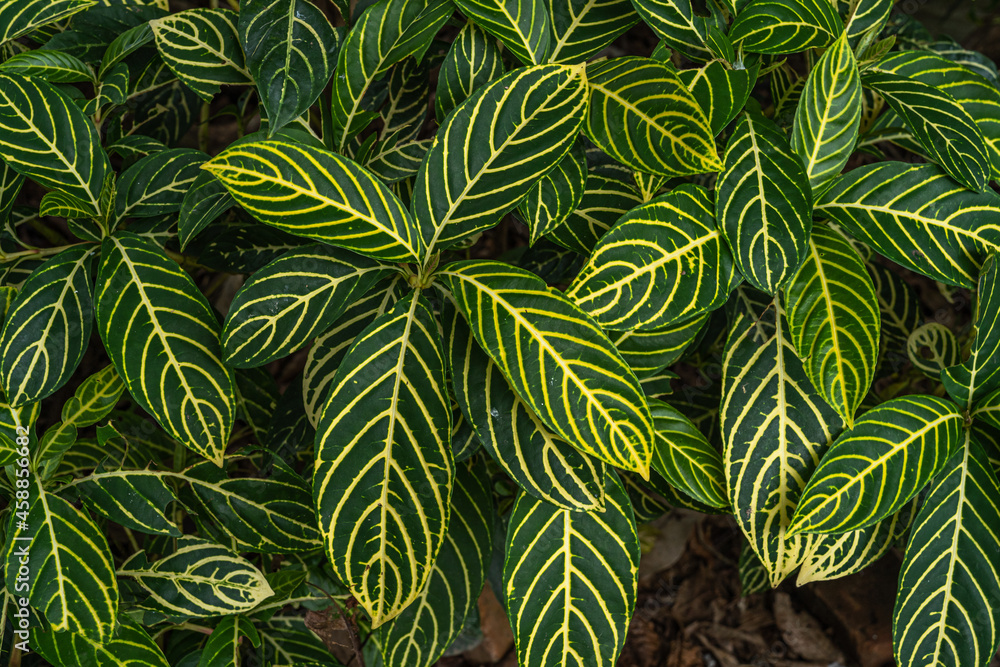 Sanchezia Speciosa Leonard,Green leaves pattern with yellow stripes for background,Beautiful zebra pattern with bright texture Shrubby White Vein or Gold Vein Plant Mala leaves on tree in the garden