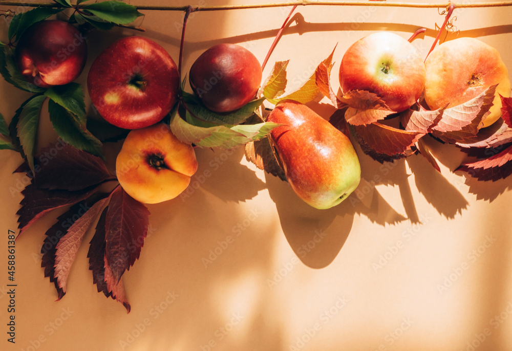 Autumn harvest concept Thanksgiving Day. Ripe red and yellow fruits apples pears grapes and leaves