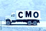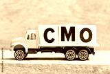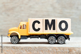 Toy truck hold alphabet letter block in word CMO (Abbreviation of Chief Marketing Officer, Contract Manufacturing Organization) on wood background
