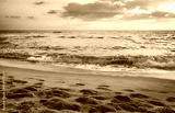 Tropical sandy beach with footprints in the sand at sunset, focus on the foreground, color toning applied.