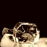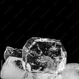 Installation made of pieces of ice on a black background. A macro view of frozen ice cubes with a unique pattern and texture. Christmas New Year and cold winter decorative wallpaper. copy space.