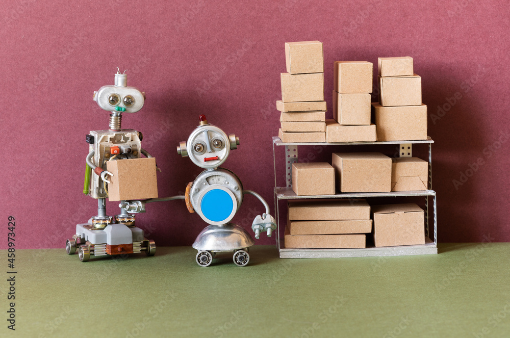 Automation of storage, delivery and sorting of shipments. The robots sorts boxes of different sizes on the shelves of the rack.