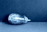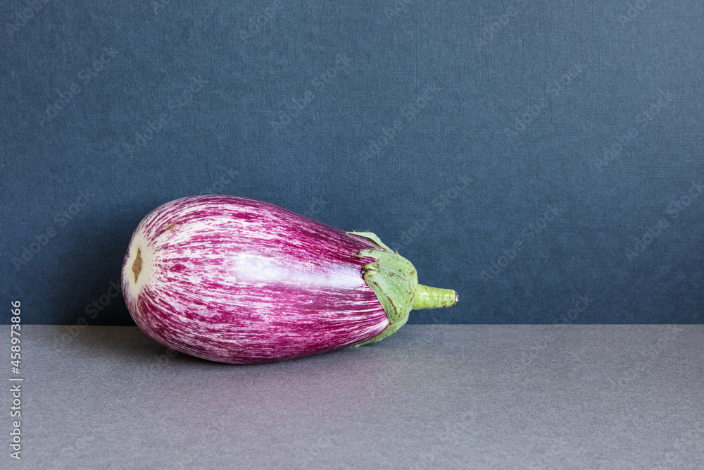 Ripe organic violet aubergine eggplant. Vegetable on a two-tone background of gray and dark shades, copy space