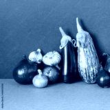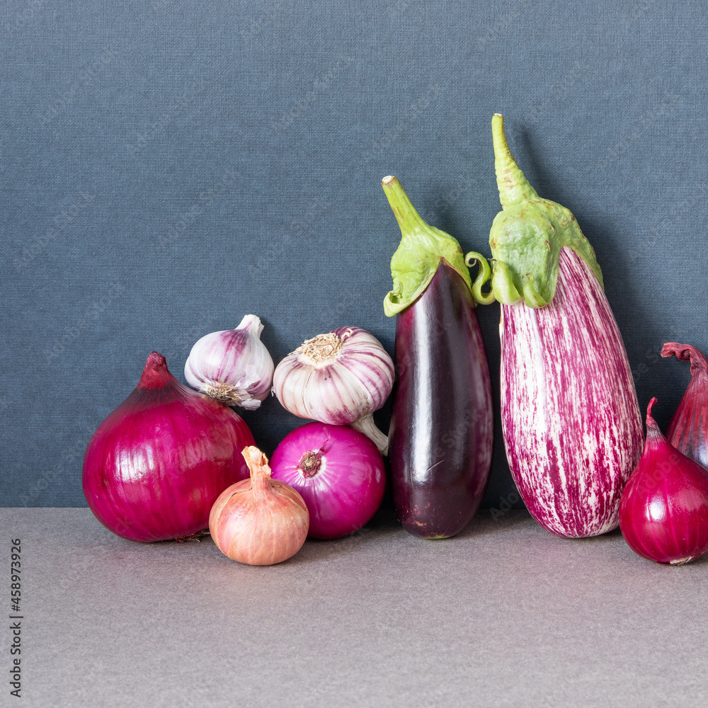 Still life composition of vegetables purple violet colors. Combinations of natural tones and patterns. Farmer harvest ripe aubergine eggplant, red onion garlic on grey dark background.