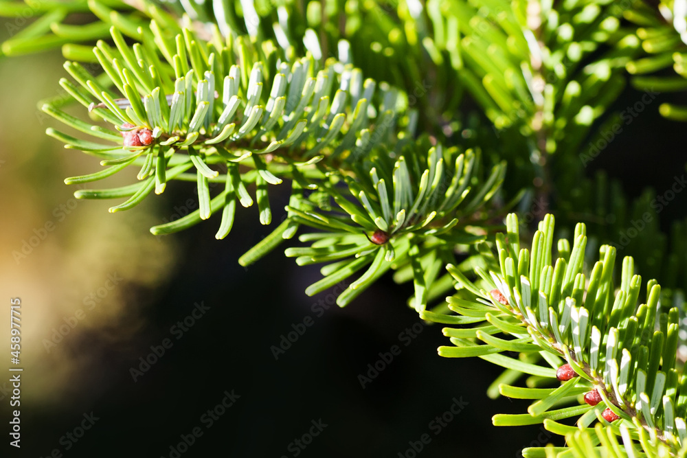 Natural spruce tree branches close-up photo. Sunny day light. macro view, shallow depth of field