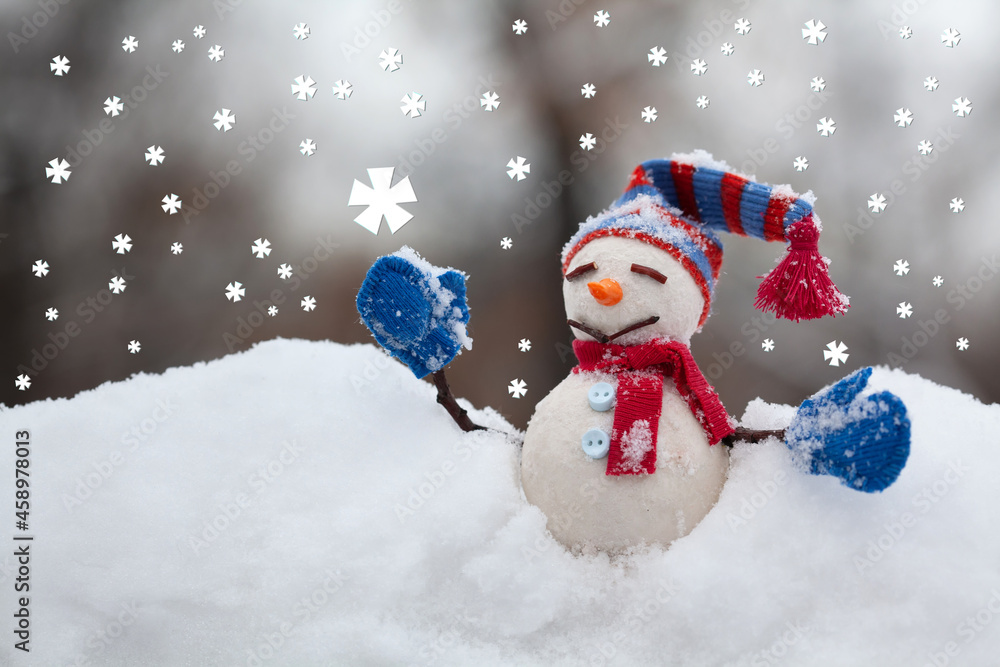 Snowman toy with hat red scarf and blue mittens on snowy field background. Happy New Year and Merry Christmas postcard.