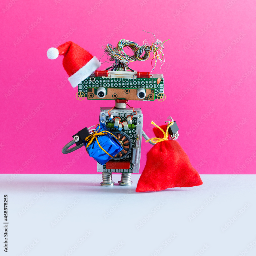 Toy robot Santa Claus with a traditional red hat and a big bag of gifts. Pink gray background, copy space for text. Christmas New Year poster card template toy style.