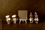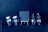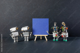 Promotion billboard poster on a wooden easel. Four toy robots are looking at a blank blue paper canvas. black background. Invitation gallery postcard concept