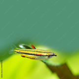Bright aquarium fish Dwarf Pencilfish Nannostomus marginatus. Macro view, selective focus. copy space green background