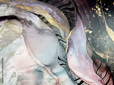 Abstract purple background with gold and grey — motley art with beautiful smudges and stains made with alcohol ink and golden acrylic. Fluid texture resembles marble, petals, watercolor or aquarelle.