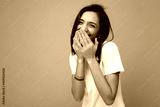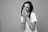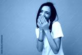 Portrait of happy positive young beautiful brunet lady with sincere emotions wearing casual white t-shirt for mockup isolated on blue background with copy space and laughing covering mouth