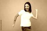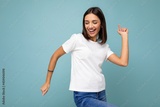 Photo of positive smiling young beautiful brunette woman with sincere emotions wearing casual white t-shirt for mockup isolated over blue background with copy space and dancing
