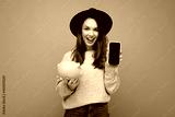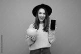 Portrait photo of happy positive smiling satisfied sincere young attractive brunette woman wearing stylish grey sweater and black hat isolated on blue background with free space and holding pink pig