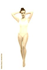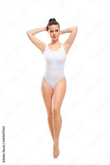 Young, fit and beautiful brunette woman in white swimsuit isolated on white background. Healthcare, diet, sport and fitness.