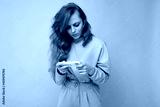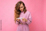 Beautiful young woman wearing casual clothes standing isolated over background surfing on the internet via phone looking at mobile screen